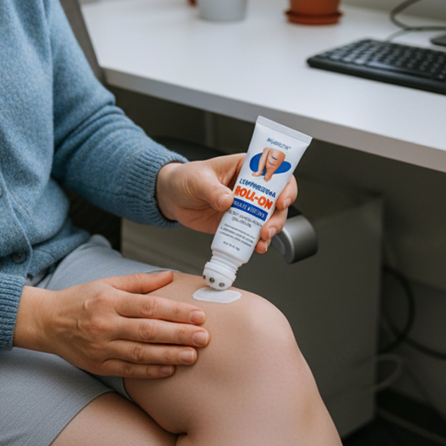 Gently squeeze a small amount of KUBOZN® Lymphedema Roll-On Cream onto the roller head.